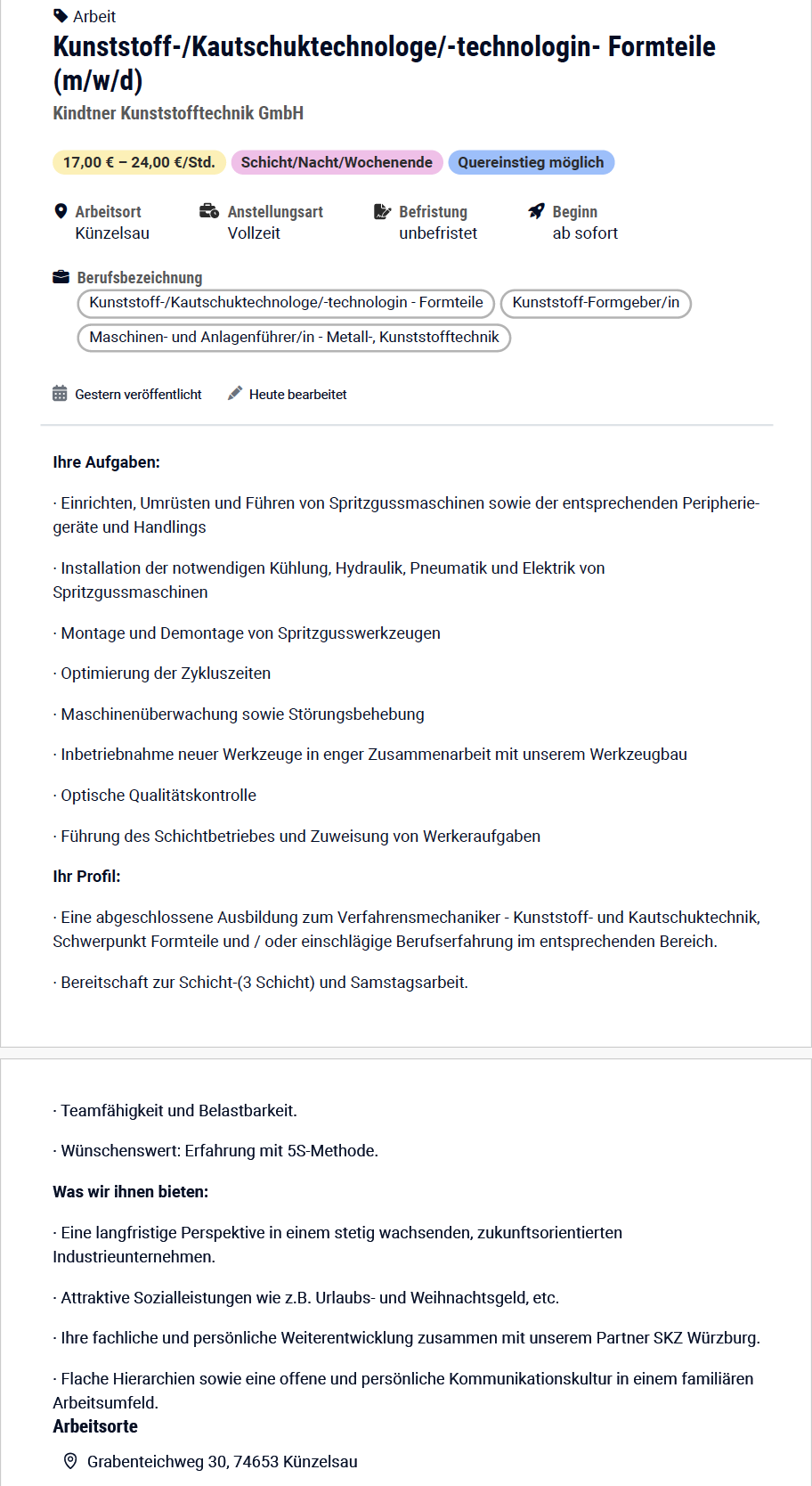 - Kunststoff-/Kautschuktechnologe/-technologin- Formteile (m/w/d) – Detailübersicht hier klicken –